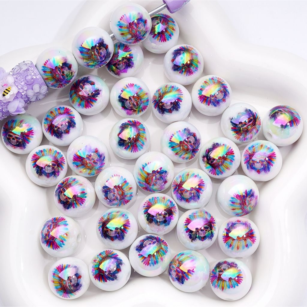 UV Coating Halloween Skeleton Head with Colorful Feather Round Acrylic Beads,16MM