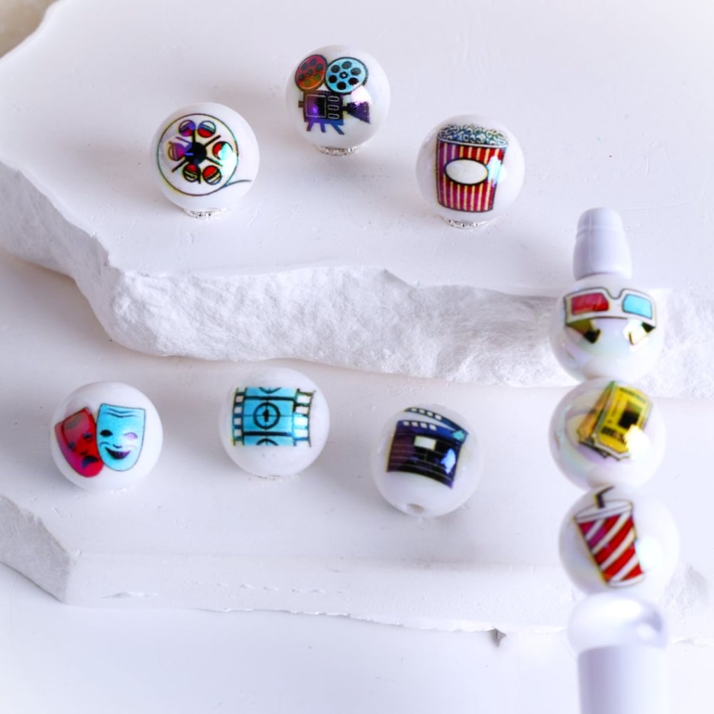 UV Coating Movie Film White Round Acrylic Beads, 16MM, Random Mix