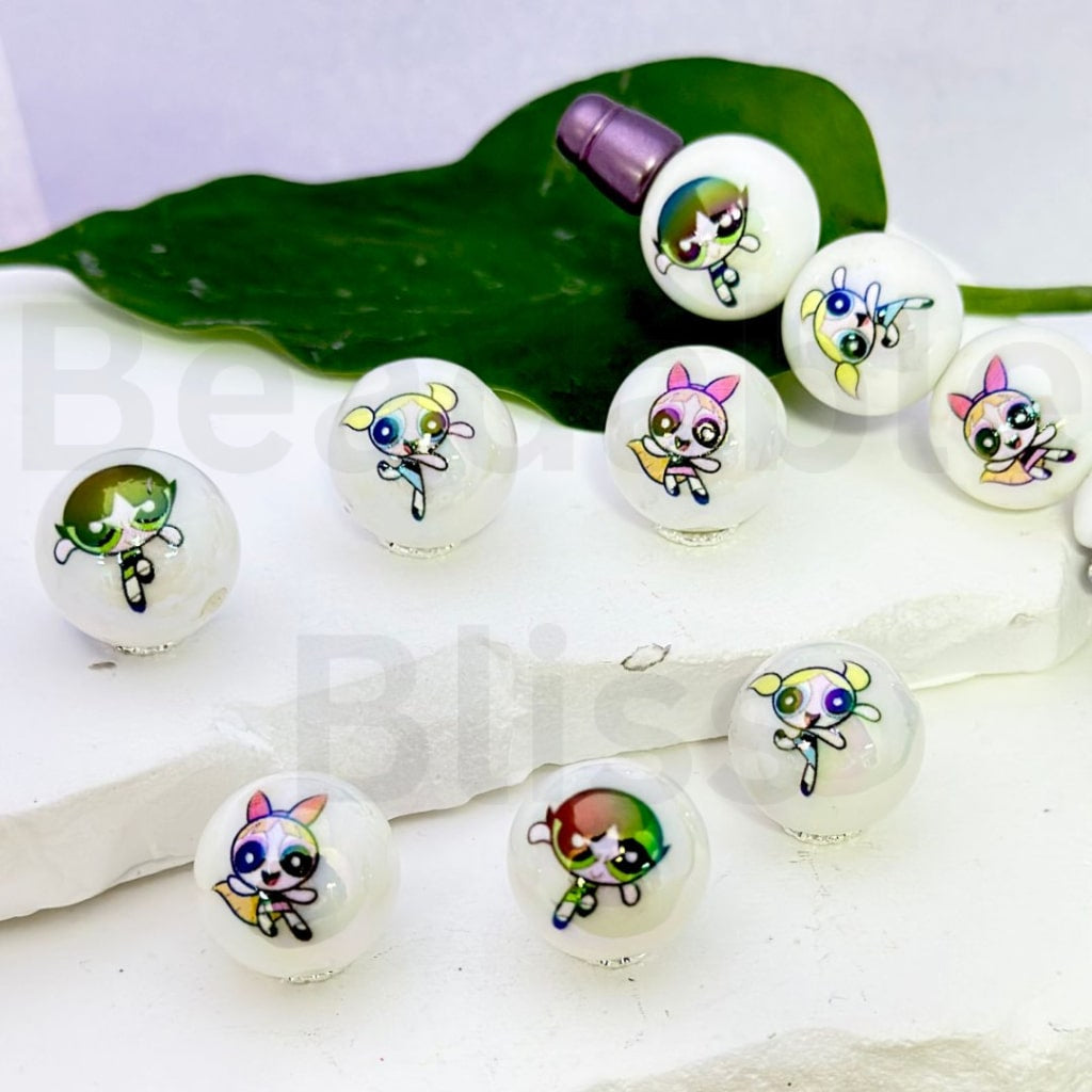 UV Finish Cute Powerpuf Girls White Round Acrylic Beads, 16MM