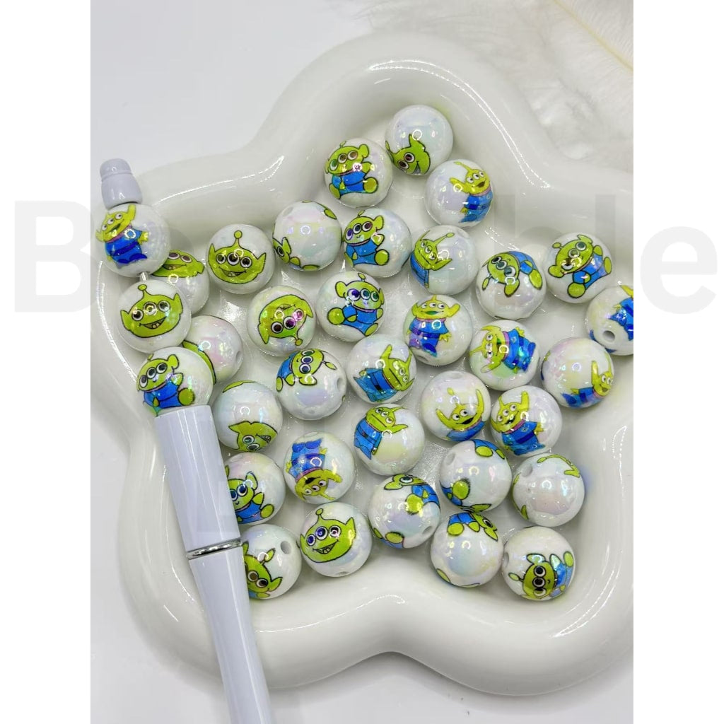 UV Finish Green Alien Toy Friends White Round Acrylic Beads, Random Mix, 16MM