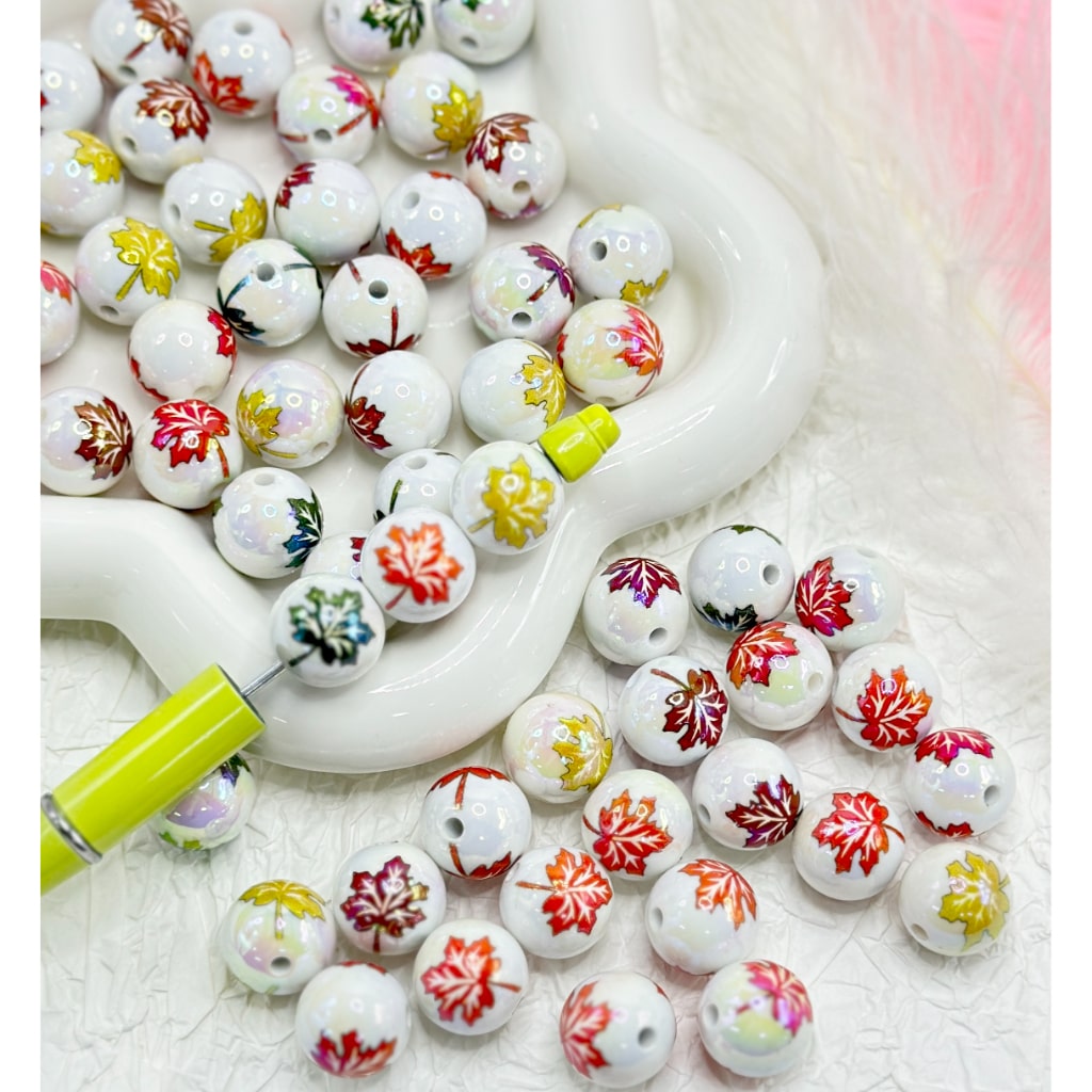 UV Finish Maple Leaf White Round Acrylic Beads, Random Mix, 16MM